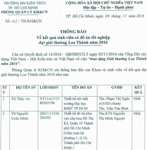 Kết quả sinh viên có Đồ án tốt nghiệp đạt giải thưởng Loa Thành năm 2016
