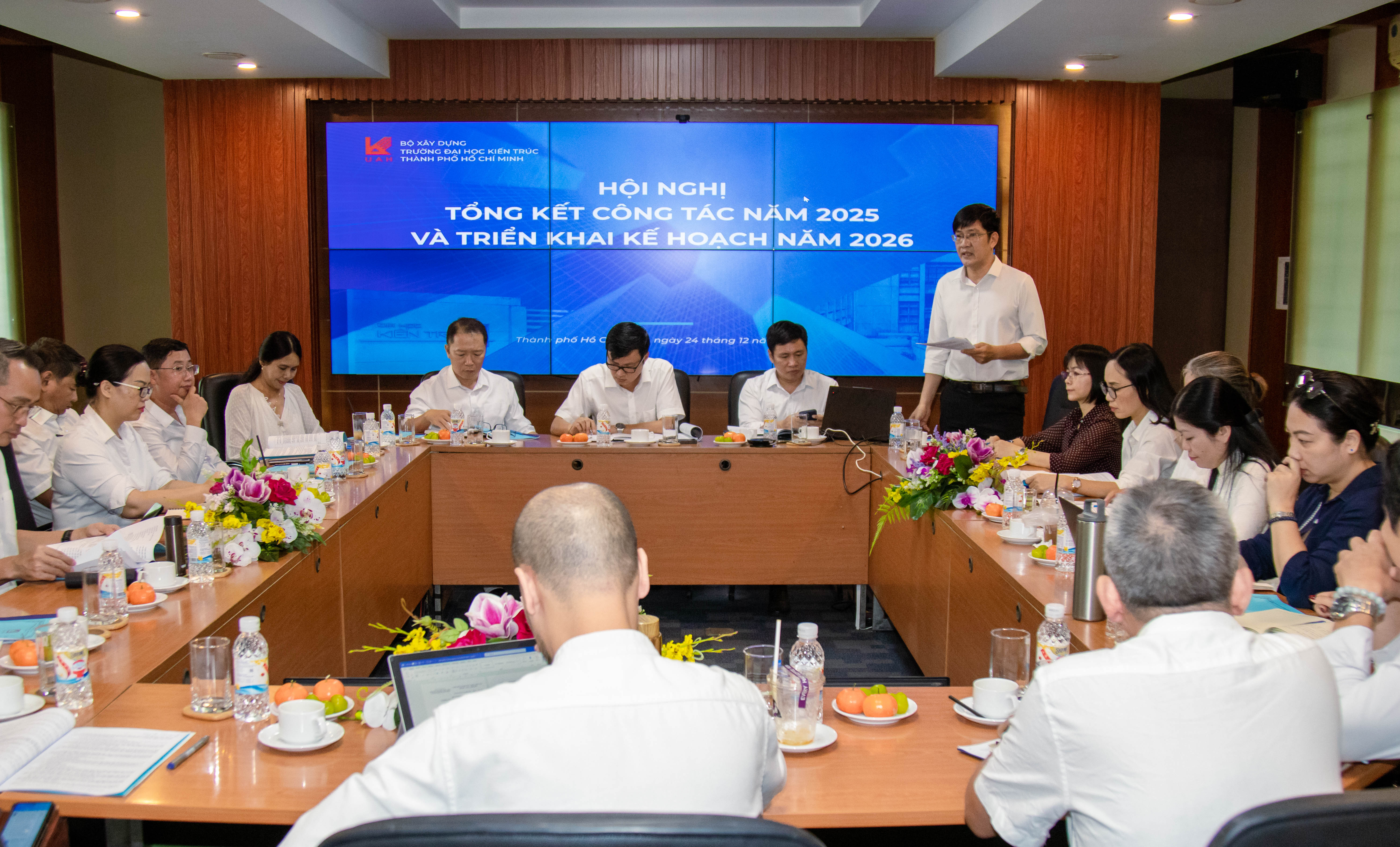 Kết thúc các phiên trình bày và trao đổi, PGS.TS.KTS. Phạm Trọng Thuật - Hiệu trưởng Nhà trường nhận định năm 2026 tiếp tục đòi hỏi sự phối hợp chặt chẽ, kỷ luật trong triển khai kế hoạch và tinh thần trách nhiệm cao của toàn thể các đơn vị. Trên nền tảng những kết quả đạt được trong năm 2025, Nhà trường xác định tiếp tục giữ vững nhịp độ đổi mới, tập trung vào chất lượng, hiệu quả và phát triển bền vững, qua đó từng bước khẳng định vị thế, uy tín và vai trò của Trường trong hệ thống giáo dục đại học cũng như trong đời sống xã hội.