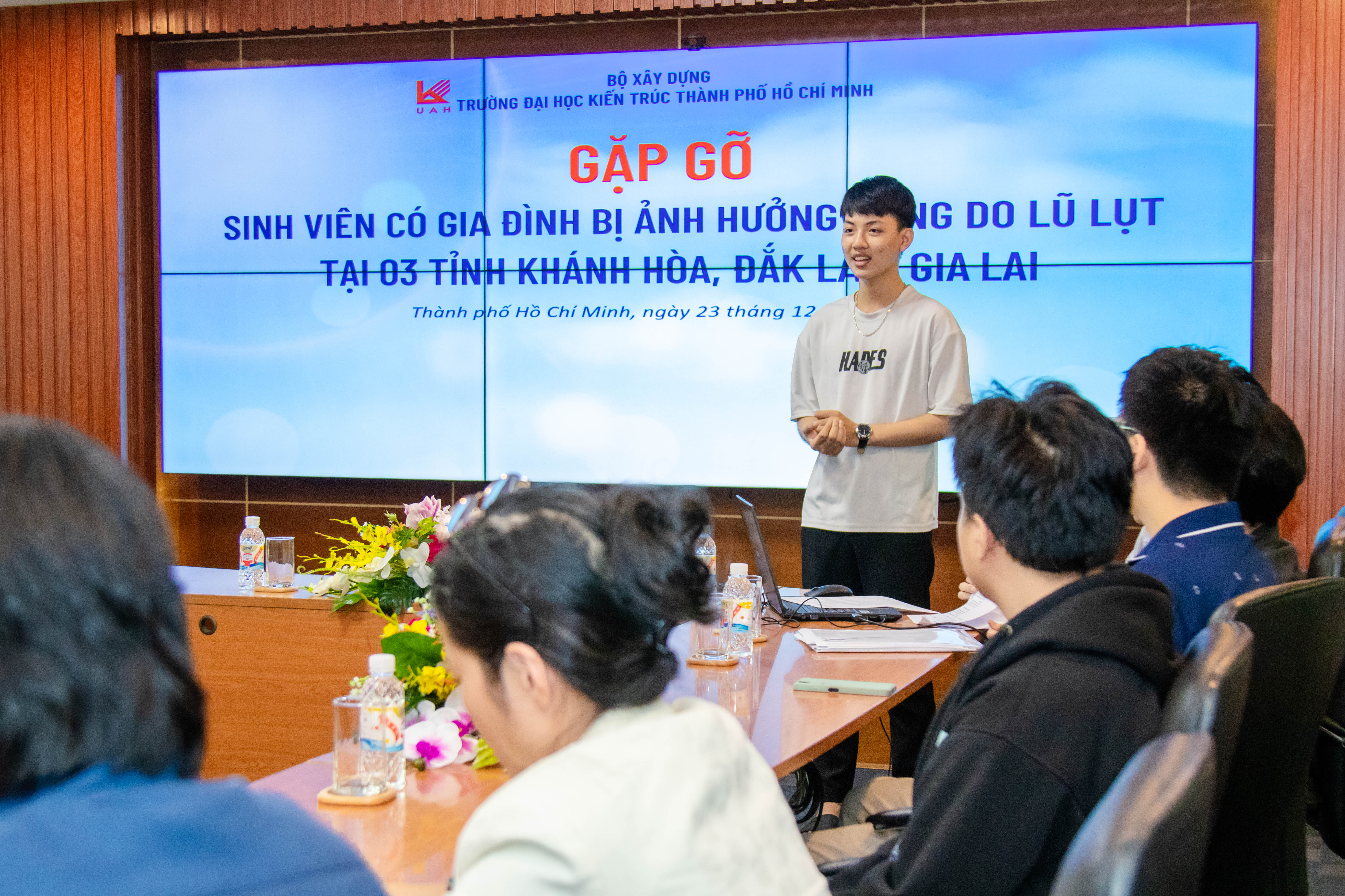 Tại buổi họp mặt, TS.KTS. Trương Thanh Hải - Phó Hiệu trưởng Nhà trường bày tỏ sự thấu hiểu trước những khó khăn mà sinh viên và gia đình đã trải qua. Thầy chia sẻ: “Thầy cô hiểu rằng những thiệt hại sau lũ không chỉ là mất mát trước mắt, mà còn ảnh hưởng lâu dài đến sinh kế và đời sống của gia đình các em. Nhà trường mong rằng sự hỗ trợ này sẽ giúp các em cảm nhận được sự quan tâm, từ đó có thêm động lực để tiếp tục học tập và từng bước ổn định cuộc sống”.
