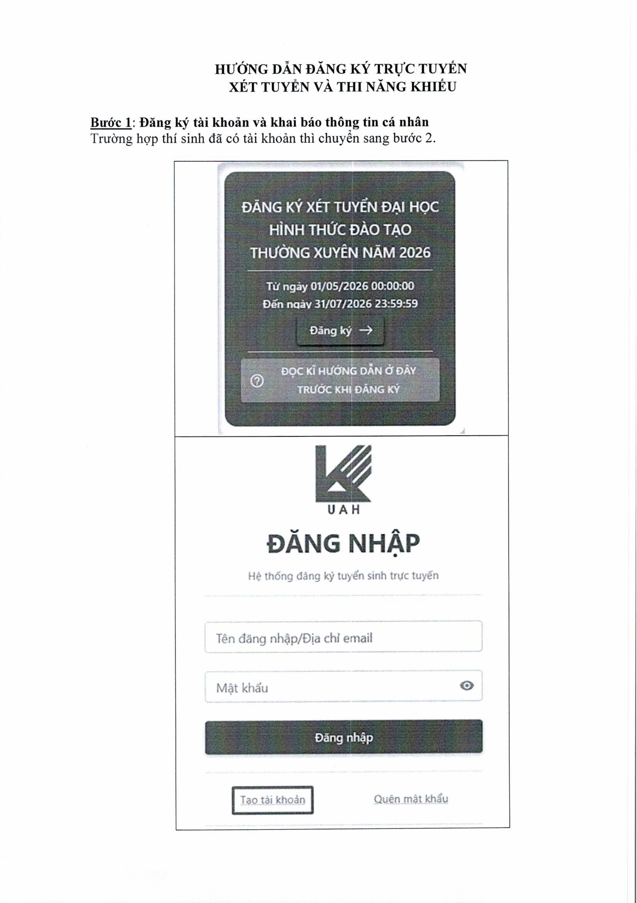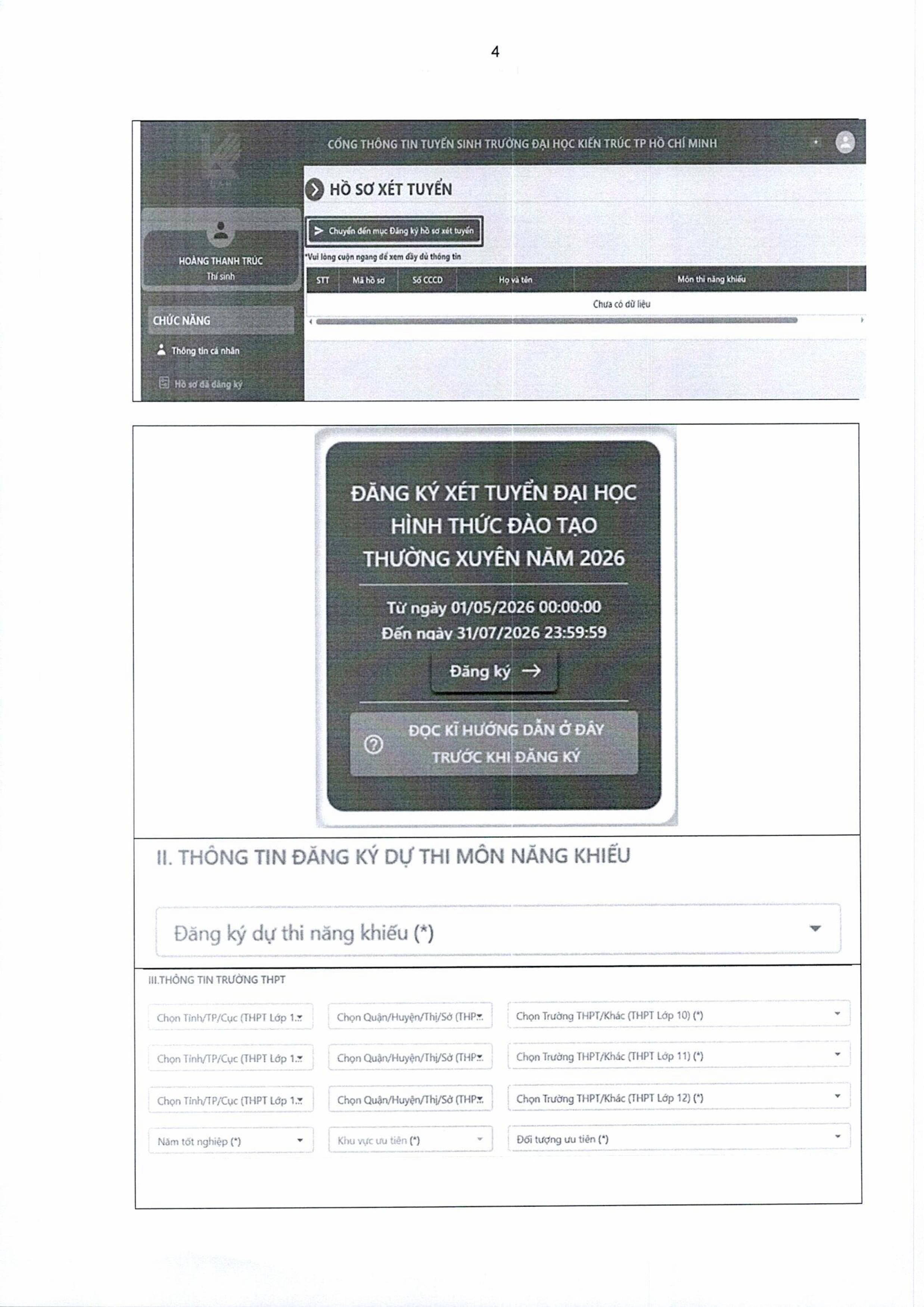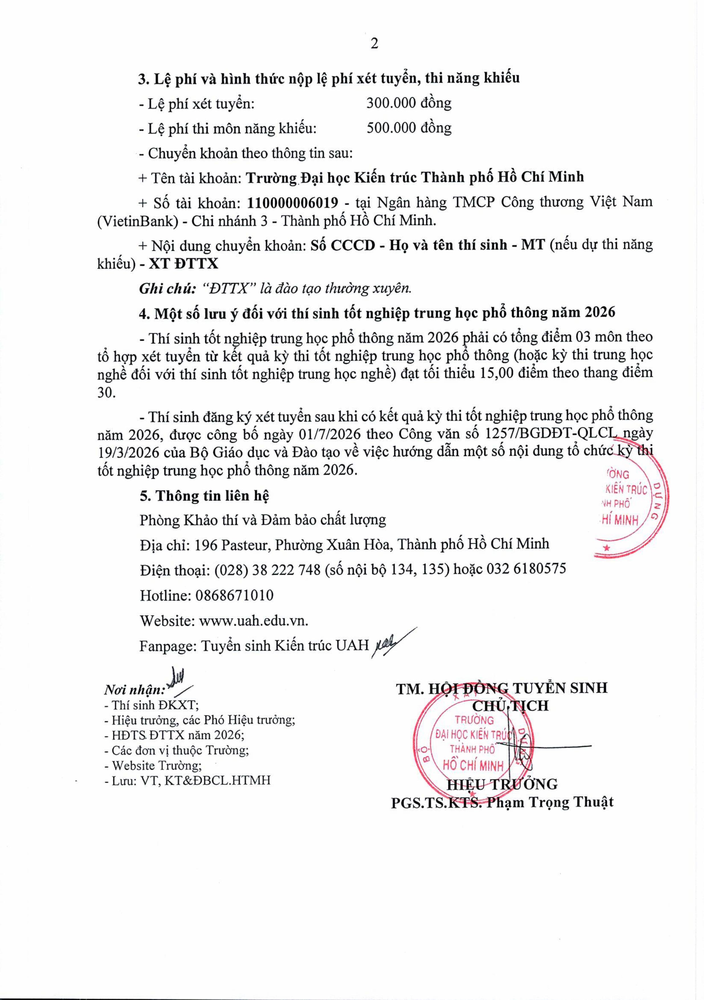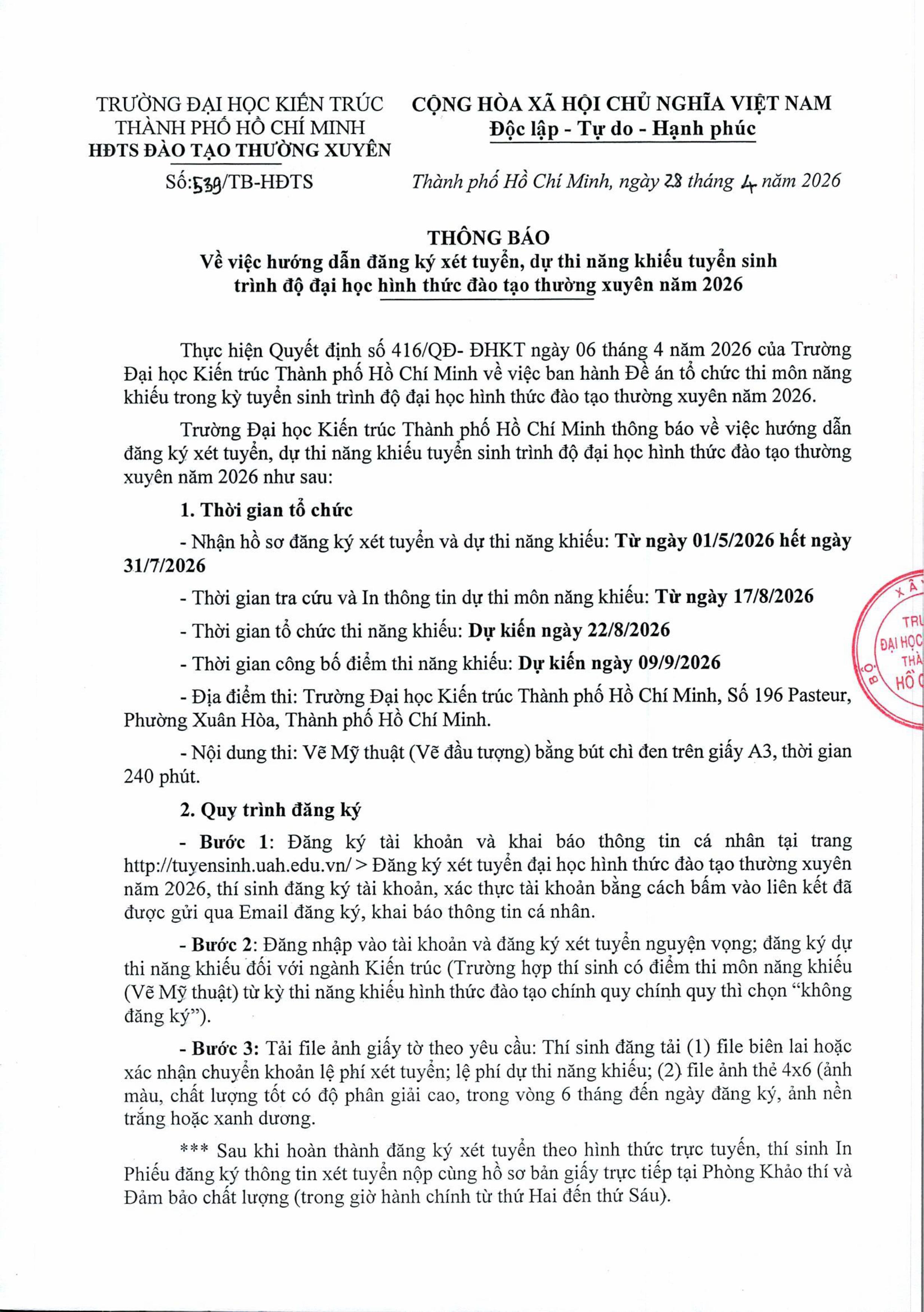 Thông báo 539/TB-HĐTS về việc hướng dẫn đăng ký xét tuyển, dự thi năng khiếu tuyển sinh trình độ đại học hình thức đào tạo thường xuyên năm 2026