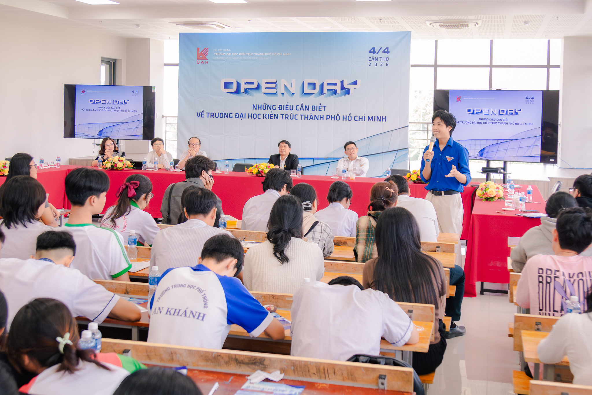 Sáng 4/4/2026, sự kiện Open Day tại Trường Đại học Kiến trúc Thành phố Hồ Chí Minh (UAH) - cơ sở Cần Thơ đã diễn ra trong bầu không khí vô cùng sôi nổi, thu hút gần 200 học sinh và phụ huynh khu vực Đồng bằng sông Cửu Long tham dự. Không chỉ là nơi giải đáp những băn khoăn về kỳ thi năng khiếu sắp tới, ngày hội còn là không gian kết nối, giúp các bạn trẻ tận mắt tiếp cận môi trường học tập sáng tạo và củng cố niềm tin vững chắc trên hành trình theo đuổi khối ngành Kiến trúc, Xây dựng, Nội thất.