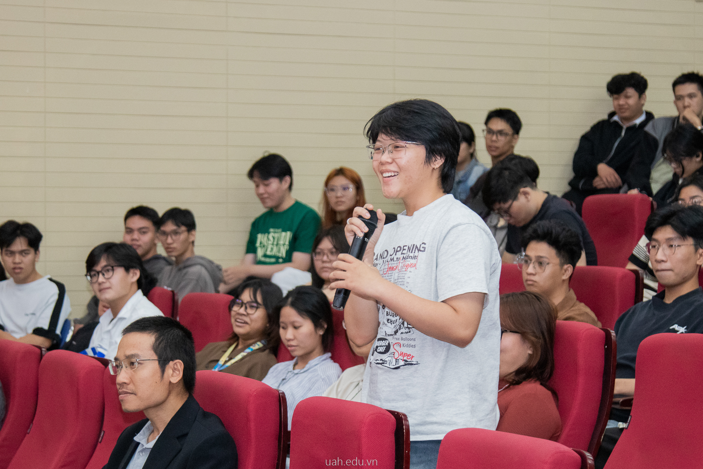 Sức nóng của khán phòng càng rõ rệt khi chương trình bước sang phiên thảo luận trực tiếp giữa sinh viên và các diễn giả