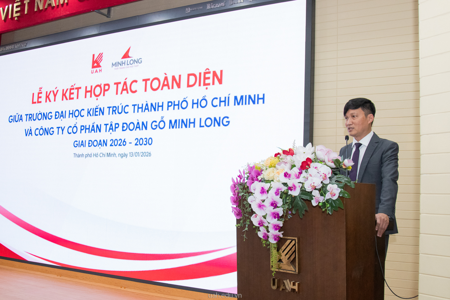 Phát biểu tại buổi lễ, PGS.TS.KTS. Phạm Trọng Thuật - Hiệu trưởng Nhà trường khẳng định tầm nhìn chiến lược trong việc thắt chặt mối quan hệ “kiềng ba chân”: Nhà nước - Nhà trường - Doanh nghiệp. Thầy nhấn mạnh: “Không đâu tốt hơn môi trường của các doanh nghiệp để sinh viên có cơ hội tiếp cận với những sản phẩm, công nghệ, để thực chứng những kiến thức đã học”. Sự hợp tác với Gỗ Minh Long được kỳ vọng sẽ hiện thực hóa các cam kết đào tạo, giúp sinh viên tiếp cận sâu hơn với vật liệu, công nghệ và tư duy sáng tạo của một doanh nghiệp hàng đầu trong lĩnh vực nội - ngoại thất tại Việt Nam.