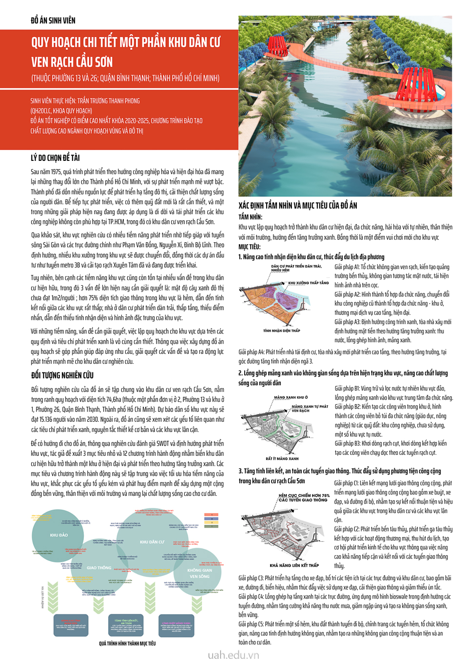 Thực tiễn cho thấy, đồ án tốt nghiệp của sinh viên không chỉ đáp ứng yêu cầu học thuật mà còn mang tính ứng dụng cao, trực diện giải quyết các vấn đề tồn tại của đô thị Việt Nam. Tiêu biểu là đồ án đạt Giải Nhất Sinh viên tốt nghiệp xuất sắc năm 2025 của sinh viên Trần Trương Thanh Phong. Đề tài tập trung nghiên cứu khu dân cư ven rạch Cầu Sơn, nơi chịu tác động nặng nề bởi ngập lụt, ô nhiễm và thiếu hụt hạ tầng xã hội. Đồ án đề xuất các giải pháp tái cấu trúc không gian theo hướng xanh bền vững, tận dụng quỹ đất công nghiệp cũ để bổ sung mảng xanh và tiện ích công cộng. “Giải thưởng giúp em ý thức rõ hơn trách nhiệm của một kiến trúc sư quy hoạch không chỉ vẽ bản đồ, mà là tìm lời giải cho sinh kế và môi trường sống của người dân”, Thanh Phong chia sẻ.