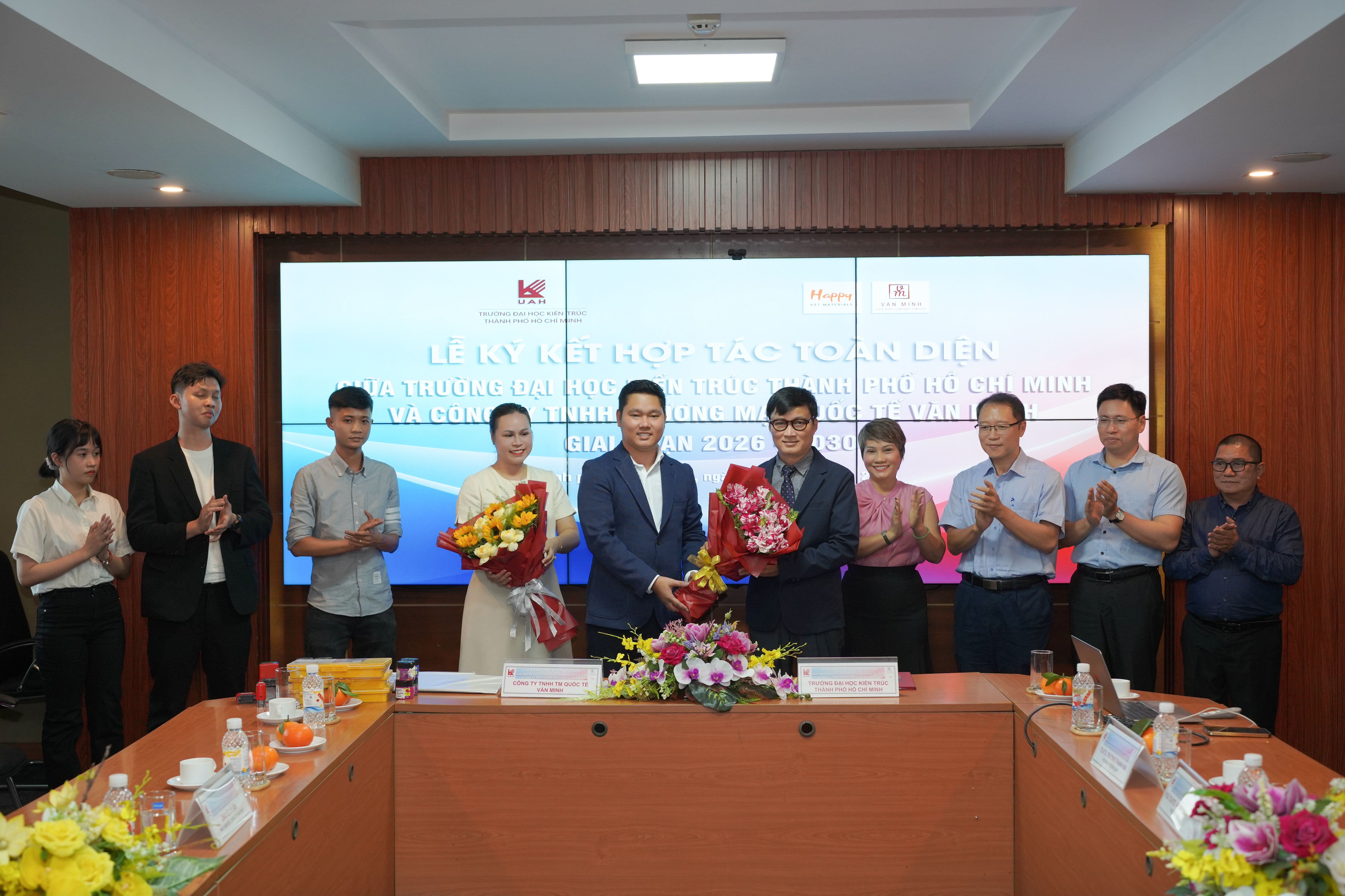 Chiều ngày 10/3/2026, Trường Đại học Kiến trúc Thành phố Hồ Chí Minh (UAH) và Công ty TNHH Thương mại Quốc tế Văn Minh chính thức ký kết thỏa thuận hợp tác giai đoạn 2026-2030. Sự kiện không chỉ đánh dấu bước tiến mới trong chiến lược gắn kết đào tạo thực tiễn giữa Nhà trường và doanh nghiệp, mà còn nổi bật bởi sự quan tâm đầy tâm huyết từ Công ty Văn Minh nhằm tiếp sức cho tài năng trẻ UAH trong tương lai.