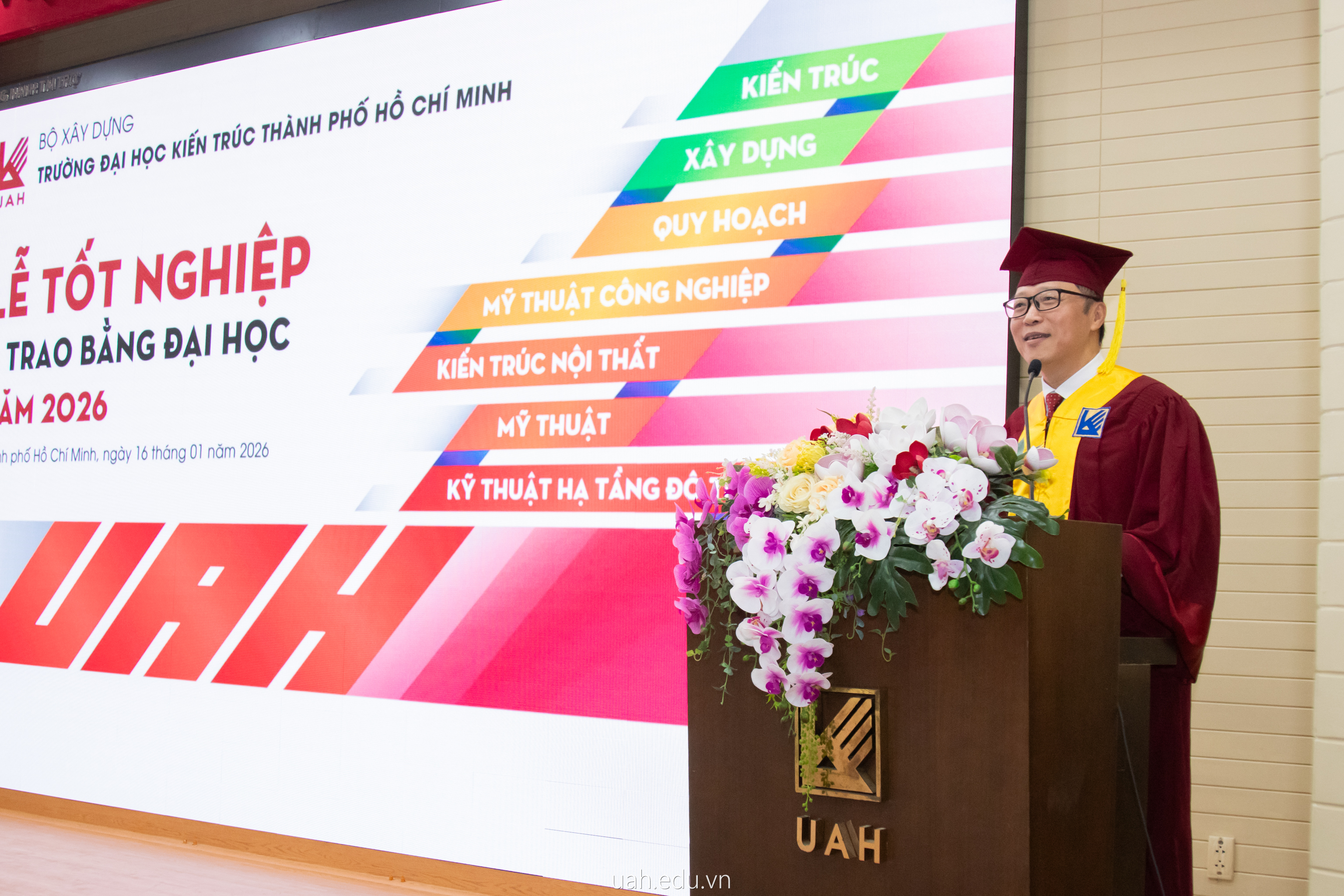 Trước đông đảo sinh viên thuộc nhiều khóa học, nay chính thức trở thành tân Kiến trúc sư, tân Kỹ sư và tân Cử nhân, TS.KTS. Trương Thanh Hải - Phó Hiệu trưởng Nhà trường đã bày tỏ tâm sự: “Có lẽ đây là lần cuối Thầy gọi các bạn bằng hai tiếng thân thương “các em”. Sau ngày hôm nay, chúng ta có thể sẽ là đồng nghiệp, mỗi người bước vào một hành trình riêng. Dù các em theo con đường thiết kế, quản lý, nghiên cứu hay khởi nghiệp, hãy luôn tự hào mình là sinh viên Trường Đại học Kiến trúc Thành phố Hồ Chí Minh - một ngôi trường mang truyền thống học thuật và trách nhiệm xã hội”.