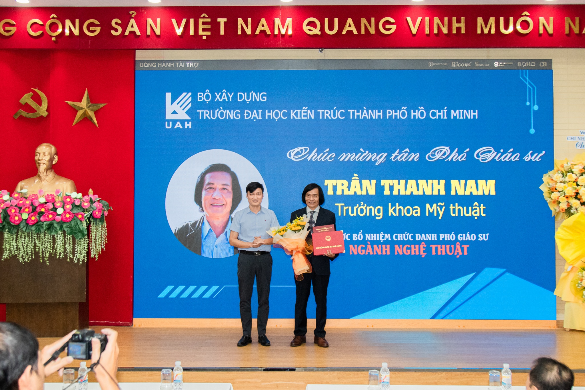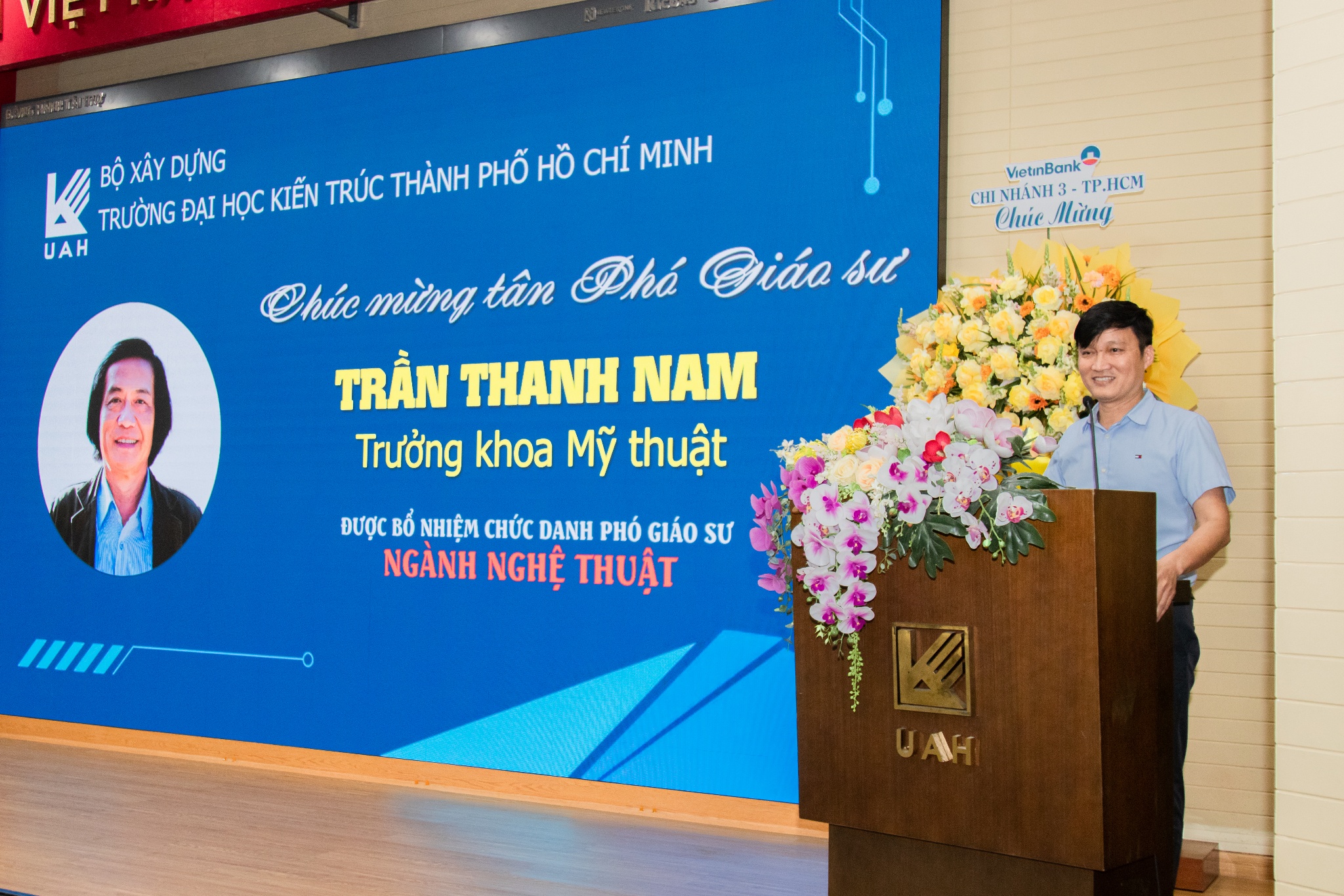 Tâm điểm của buổi lễ là khoảnh khắc công bố Quyết định bổ nhiệm chức danh Phó Giáo sư đối với TS. Trần Thanh Nam - Trưởng khoa Mỹ thuật. Đây là dấu son đặc biệt của khoa Mỹ thuật nói riêng và Nhà trường nói chung bởi trong đợt xét duyệt năm nay của Hội đồng Giáo sư Nhà nước, ngành Nghệ thuật chỉ có 02 ứng viên đạt chuẩn trên toàn quốc, và thầy Nam là một trong số đó.