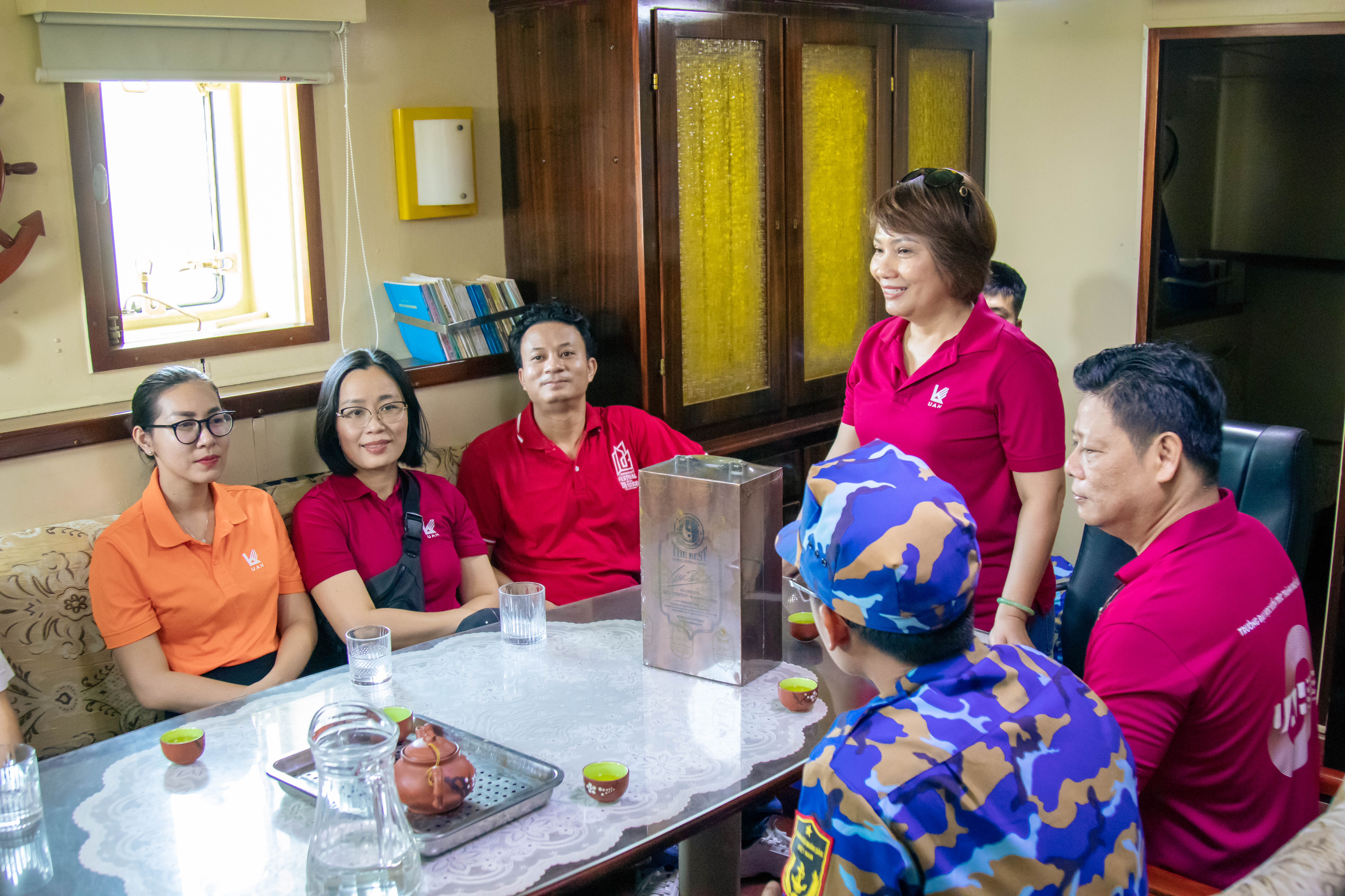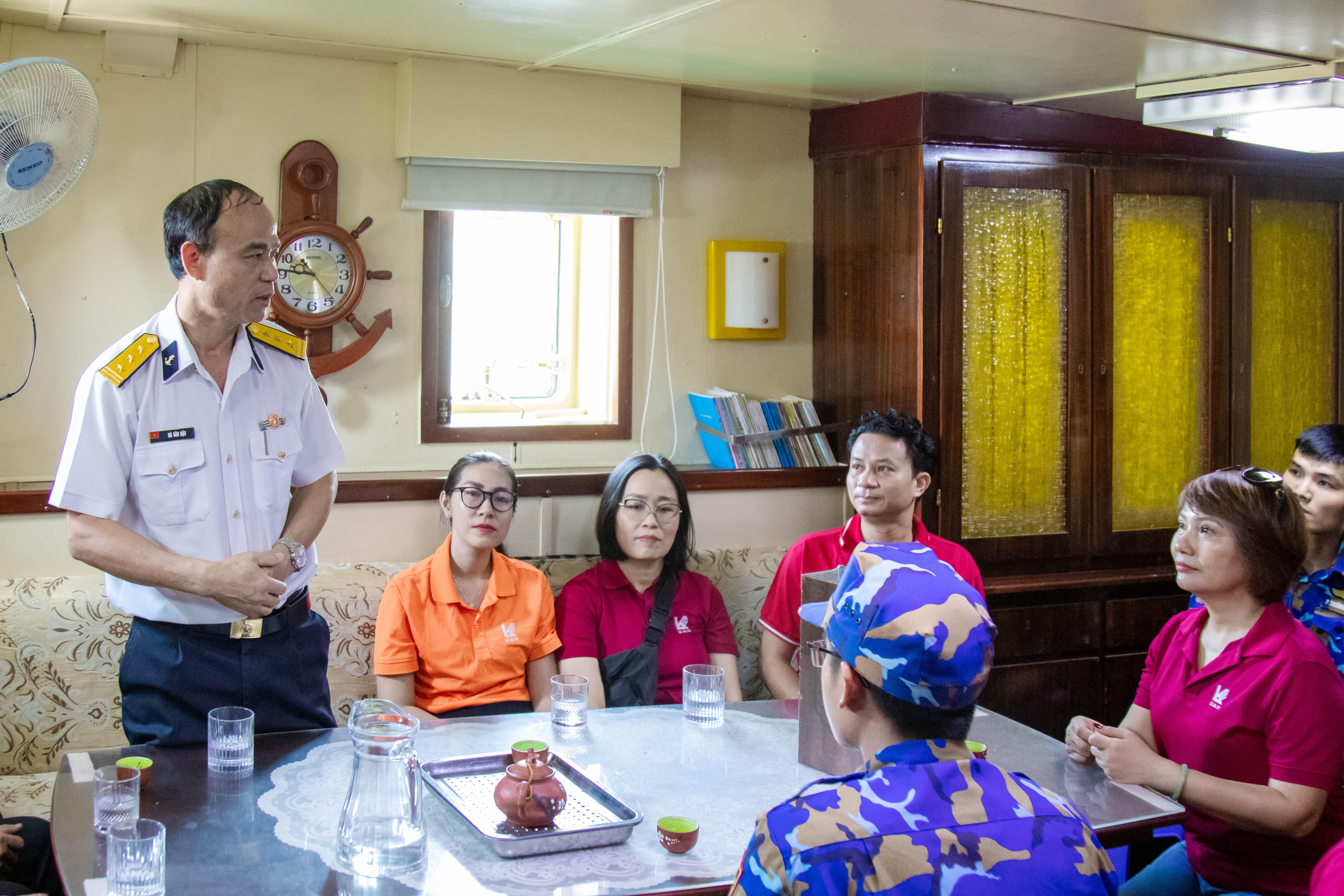 Cán bộ, chiến sĩ tàu 960 thông tin đến đoàn công tác về lịch sử con tàu và các nhiệm vụ vận tải quân sự, bảo vệ thềm lục địa phía Nam